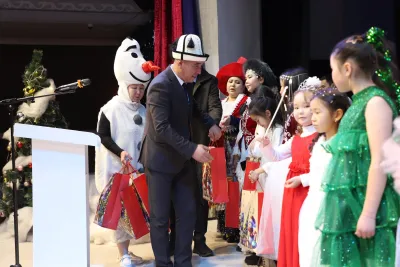 Талас шаарынын мэри Нургазы Асылбеков балдарды келе жаткан жаңы жыл майрамы менен куттуктап, келечек ээлерине окууда ийгиликтерди, бекем ден соолук жана бактылуу балалык каалады.